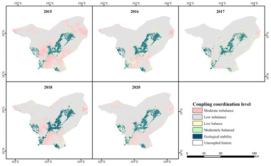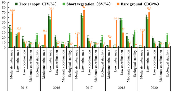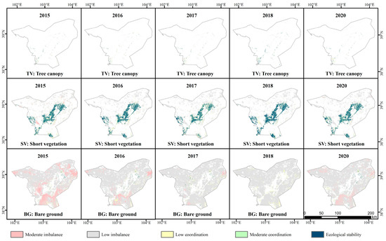 - Under different vegetation cover scenarios, the level of soil–vegetation spatial coupling coordination differed. In particular, bare land showed moderate and low imbalance, and the short cover and canopy areas showed low and moderate coordination. The area of coordination within the study area was small, indicating ecological imbalance and suggesting that soil–vegetation systems have not achieved stability.