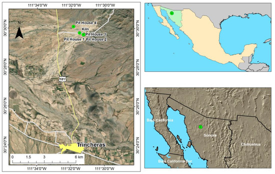 La Playa, located in the municipality of Trincheras, Sonora (Figure 1), is considered one of the most representative sites in Northwestern Mexico/Southwestern United States of the Early Agriculture period [2,8,10,11,12]. It is characterized by various cultural processes: the introduction of the first cultigens in the region, the development of techniques for irrigation canals, the technology of the projectile points, and the construction of Pit Houses. The latter is poorly represented in the archaeological record due to the strong erosion that affects the site, making it a challenge to find the few specimens suitable for investigations.