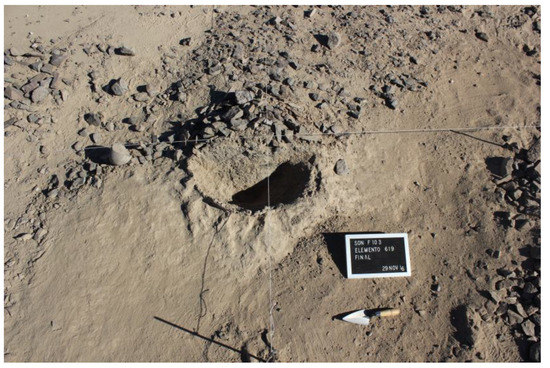 Feature 550 (30°29′40.57″ N, 111°31′16.41″ W—Pit House 3, Figure 2e) is particular because its systematic excavation began in November 2010 when it was located in one of the runoffs of the area called Viejo Campamento. It has been proposed that these areas are associated with the settlements of the Early Agricultural Period (800 B.C. to A.D. 200) [25]. This completely charred house revealed a perfectly preserved floor covered by a thin charcoal layer. About 3 to 4 cm post holes in the wall of the house were also detected. This was interpreted as the ocotillo tree frame that makes up the architectural structure of the pit house. The structure seems completely collapsed during the intense firing episode and was what allowed its identification. After the first 30 cm excavated, the delimitation of the house was very clear, marking a circumference that revealed the compacted walls. Almost in contact with the floor of the house, we were able to locate several circular spots, of between 2.5 and 3 cm, with fragments of coal inside. The characteristics of this evidence allowed us to suppose that it was about the secondary posts of the structure that gave shape and supported the walls of this house pi house.