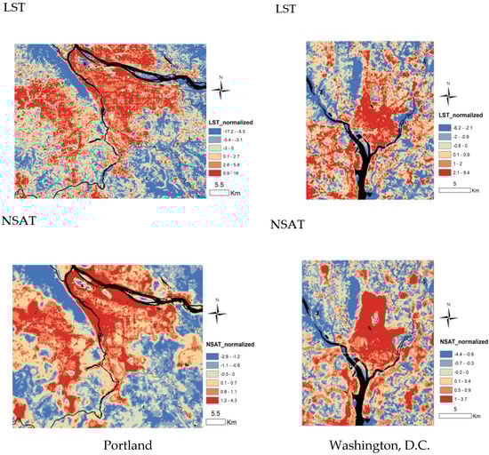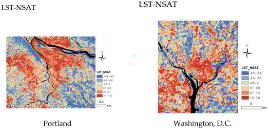 We begin by describing the descriptive statistics of LST, NSAT, LST-NSAT for each LC class at Portland and Washington, D.C (Table 3 and Table 4). For Portland, the mean temperature of normalized NSAT for each class ranges from −1.38 °C to 1.44 °C (difference = 2.82 °C), and the mean temperature of normalized LST for each class ranges from −6.04 °C to 7.63 °C (difference = 13.67 °C). For Washington, D.C., the mean temperature of NSAT for each class ranges from −1.36 °C to 0.91 °C (difference = 2.27 °C), and the mean temperature of LST for each class ranges from −3.6 °C to 2.63 °C (difference = 6.23 °C). These results suggested higher temperature variability for LST than for NSAT.