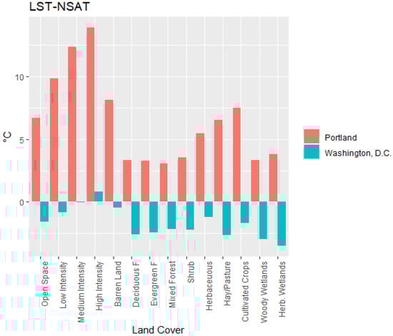 Temperature differences between LST and NSAT for Portland, Oregon and Washington, D.C. at each land class.