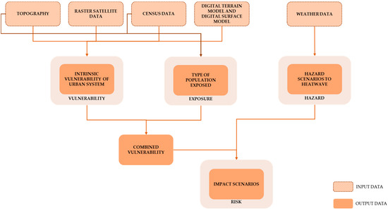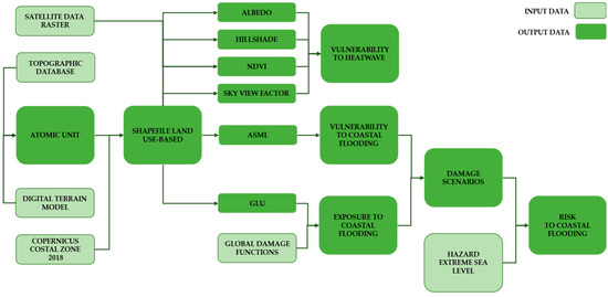 The workflow of both models was based on the risk assessment framework proposed by the IPCC in Reports AR5 and AR6 [2], in which the climate risk on urban settlements is assessed, combining hazard, vulnerability and exposure. In both models, the vulnerability meant the extent to which the physical system, open spaces and buildings were sensitive to or unable to cope with the negative effects of climate change [2].