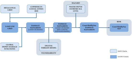 The Coast-RiskBySea model allowed for the assessment of coastal flooding impacts due to extreme sea level events on the built environment. The model used homogeneous hexagonal atomic units and remotely sensed data as the base data. The results were several risk scenarios derived from the combination of the exposed built environment type, vulnerability of coastal areas and hazard scenarios to the extreme sea level. The Coast-RiskBySea model workflow is schematized in Figure 2.