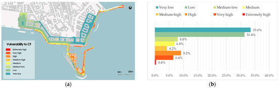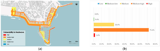 As shown in Figure 5, the most vulnerable areas are those located along the coast and along the piers, which have low elevation levels. In terms of the percentage distribution, more than 60% of the open spaces fell into the Low or Very low vulnerability classes, while only 16% were classified as High, Very high or Extremely high.