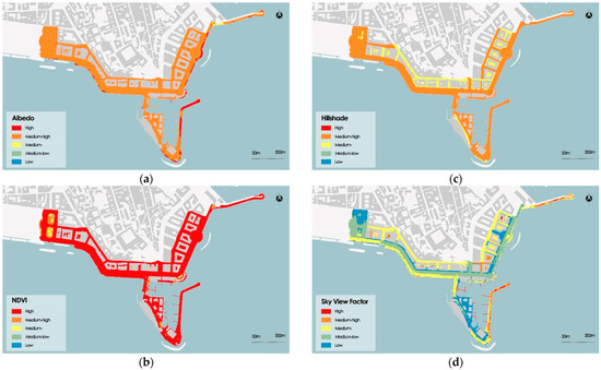 The HW vulnerability of open spaces was assessed by considering the interaction between the 4 basic indicators: Albedo, Hillshade, NDVI and Sky View Factor, following the methodological framework [41] adopted in the PLANNER model. To each indicator a weight was given with which the vulnerability could be summarised through a weighted average.