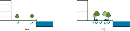 The effectiveness of NBSs concerning urban floods is evident, as the green areas contribute to the water’s correct drainage, both rainwater and seawater [6,29,30], but NBSs can also reduce the impacts of heatwaves, maximising the urban surface temperature cooling [5,31,32]. Moreover, “greening measures” in the built environments can allow ecosystem-based regeneration processes [33].