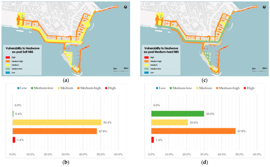 (a) Map of vulnerability to HW with the integration of soft NBS; (b) histogram of vulnerability to HW with the integration of soft NBS; (c) map of vulnerability to HW with the integration of medium-hard NBS; (d) histogram of vulnerability to HW with the integration of medium-hard NBS.