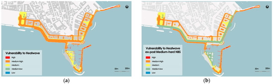 At the same time, in relation to the HW vulnerability, it was possible to note a significant improvement compared to the ex-ante scenario, both for the entire study area and especially for the areas subject to transformation (Figure 14).