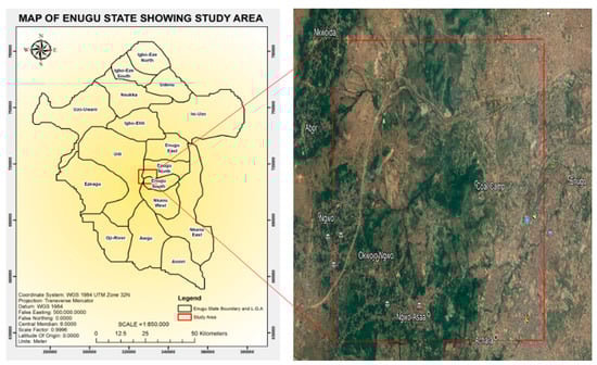 The study is carried out in the Onyeama Mine Field, Enugu State, Nigeria. The area is bounded by latitudes 6°25′ N and 6°29′ N and longitudes 7°25′ E and 7°30′ E, South East Nigeria (Figure 1). The total area is approximately 67,000 square kilometers (area bounded in red). Hills and lowlands with minor streams and rivers characterize the area. The River Ekulu and Asata River drain toward the northern and southern parts, respectively. Three geological formations characterize the area, namely Ajali sandstone, Mamu formation, and Enugu shale [26]. Toward the hilly and western part of the area, Ajali sandstone and Mamu formation are situated, while Enugu shale underlies the lowlands. Ajali sandstone is whitish to faint brown with patches of iron stains. According to [26], Enugu shale, which is visible at the extreme eastern part of the area, is fissile grey shale having a dipping direction of 2500 SW, striking 1500ES-3300 NW. The four major lithology units that characterize the area are shale, sandstone, coal, and siltstone. The sandstone is of fine to medium grade with a moderately weak consolidation quality. The coal, which comprises three thin coal seams that vary in thickness from 0.1 m to 0.9 m, is black in color. Grains of sandstone beds intercalate with flakes of pyrite mineral and make contact with the coal seams. The three geological formations (Ajali sandstone, Mamu formation, and Enugu shale) all have a normal fault with other associated fractures.