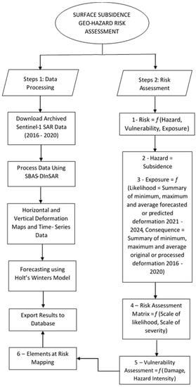 Risk = f (Likelihood = Summary of minimum, maximum, and average forecasted or predicted subsidence 2021–2024, Consequence = Summary of minimum, maximum, and average original or processed subsidence 2016–2020)