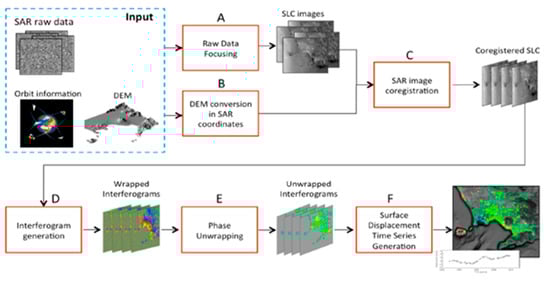 We adopted the parallel computing solution in [28] for the processing of the archived Sentinel-1 SAR images. This technique, known as the Small-Baseline Subset Differential Interferometric Synthetic Aperture Radar (SBAS-DInSAR) technique, is applied to generate Earth surface subsidence time series (TS) maps along the satellite line of sight (LOS) and to estimate the mean yearly velocity in millimetric accuracy (mm/yr). According to [28,29], the workflow of the SBAS-DInSAR technique makes use of raw SAR data acquired from the same region and with the same look angle (same acquisition geometry). The data should also have the same orbital information indicating the position of the satellite during the acquisition time and the digital elevation model (DEM) of the investigated area. In Block A of Figure 4, the raw SAR data pass a specific processing (SAR focusing) in order to be converted into a corresponding radar image, referred to as Single Look Complex (SLC). Next, co-registration is performed by geometric considerations of satellite orbital information and the topography of the area using the DEM from Shuttle Radar Topography Mission (SRTM). At this stage, the DEM has to be converted into the SAR geometry (Block B of Figure 4). This is necessary for the correct application of the co-registration step (Block C). In the next phase, the SLCs are intercalated as interferometric pairs, using a minimum baseline criterion (spatial and temporal baselines and orbital and time separations between two SAR images). The outcome of such image pairs is used for the differential interferometric phase (to generate an interferogram) (Block D). Studies have suggested that such phase difference is directly related to the ground displacement occurring between the two SAR images in such a time-space [13]. The next step is to perform the phase differencing (unwrapping the phase result to retrieve its full evolution of the displacement) (Block E). This is achieved by applying the Extended Minimum Cost Flow (EMCF) phase unwrapping algorithm [28,29]. In Block F, the residual topography estimation step is performed at a pixel level for the final retrieval of the displacement time series. The phase velocities between adjacent acquisitions are determined by the number of SAR acquisitions used for the interferometric analysis. In general, the quality and reliability of generated DInSAR results from DInSAR processing are dependent on the skill of the user and evaluation capacity [29].