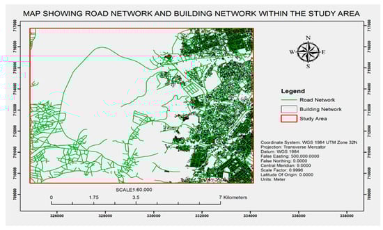 In this study, the various elements at risk are mapped, mainly the physical vulnerability dimension. Physical infrastructures that may be likely affected include roads, buildings, and open spaces. These elements are paramount and visible, and they are of interest in this study (Figure 1). The outcome of this process, which was stored in a database, has a particular focus on population density, road networks, and building networks, identified as indices for loss estimation (Figure 2 and Figure 6). The level of impact on these identified indices for loss estimation (roads and building networks) may vary across the study area due to the rate of extraction of groundwater over time, the geography and geological conditions over the years, and the population growth within the area [3,26,32].