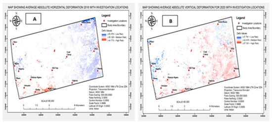 (A) Average horizontal deformation (mm) 2016 and (B) average vertical subsidence (mm) 2020 (source: [9]).