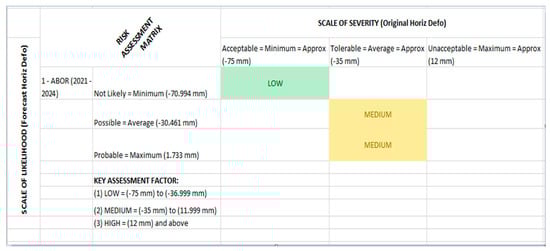 The geo-hazard risk assessment for horizontal deformation was analyzed using the risk assessment matrix of Equation (2). The risk assessment matrix is based on a scale of likelihood and a scale of severity. By matching the scale of severity against the scale of likelihood, the level of risk was summarized as low, medium, and high. Figure 8 shows the horizontal deformation risk assessment matrix for investigation location Abor. Based on the key assessment factor, the perceived risk of horizontal deformation between 2021 and 2024 ranges from low to medium. This implies that the likelihood of the horizontal deformation turning into a disaster at these locations is possible. However, this potential disaster, based on the scale of severity, would still be tolerable.