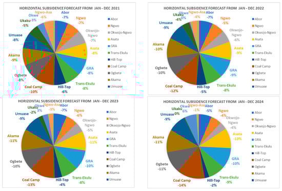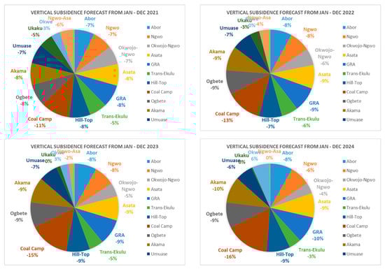 Figure 11 shows the results of the forecast for vertical subsidence made using the Holt–Winters model across the fourteen investigation locations. We made use of data on the yearly rate of vertical subsidence from January 2016 to December 2020. The prediction is for January 2021 to December 2024 (48 months). On average, there is also a gradually increasing trend of potential hazards over the years. Similarly, this increase in the vertical dimension may worsen due to adverse effects of global warming, climate change, increased poverty rate, ever-growing population, and fast-growing urbanization with a disregard for sustainability [9].