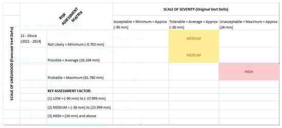 where likelihood = the summary of minimum, maximum, and average forecasted or predicted subsidence outcomes from 2021 to 2024. Since the forecasted or predicted values are tentative, they were associated with the likelihood of occurrence. Consequence = the summary of minimum, maximum, and average original extracted subsidence outcome from 2016 to 2020. Similarly, since the original extracted subsidence values are actual, they were associated with the severity of occurrence. Looking at the above, a new risk matrix is formulated in Equation (2) below.
