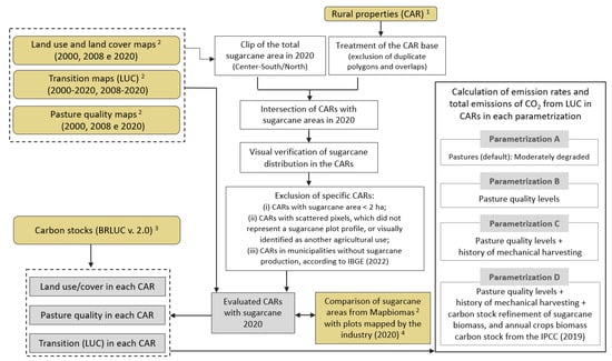 Flowchart for diagnosing land use and estimating CO2 emissions due to LUC in CARs. Developed by the authors. Source: 1 Imaflora [42]; 2 MapBiomas—col. 6 [31]; 3 Garofalo et al. [10]; 4 Raizen [43].