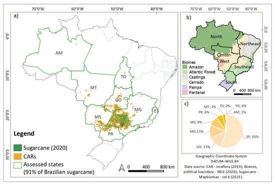 (a) Location of evaluated rural properties (CARs) and sugarcane area; (b) Brazilian regions and biomes, and (c) Distribution of the CARs by state in terms of area. Addressed states: São Paulo (SP), Minas Gerais (MG), Paraná (PR), Espírito Santo (ES), Mato Grosso (MT), Mato Grosso do Sul (MS), Goiás (GO), Amazonas (AM) and Tocantins (TO).