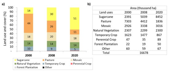 From 2000 to 2020, sugarcane expanded by over 6.06 Mha in the center–south and north regions of Brazil, totaling 8.45 Mha in 2020 (Figure 3). A correspondence of 84.7% was observed between the areas mapped as “sugarcane” according to Mapbiomas, in 2020, and the spatialized sugarcane data provided by the industry [43], which was in accordance with the accuracy of the MapBiomas mapping (accuracies of 75% and 85.5% in the Cerrado and Atlantic Forest biomes [31], respectively, where the spatialized sugarcane data provided by the industry [43] are inserted); the other sugarcane areas provided by the industry were predominantly classified as Mosaic by MapBiomas (see Supplementary Material S1, Figure S4, for more information). In 2000, 92% of the crop area was concentrated in São Paulo state and, over the period, participation of the remaining states increased, with Minas Gerais, Mato Grosso do Sul, and Goiás accounting for 27% of the sugarcane area seen in 2020. Figure 3 shows the LUC dynamics for the entire evaluated area (see Supplementary Material S1 for details of land uses by state and discretized according to MapBiomas classes). Concomitantly with sugarcane expansion (6.06 Mha), a reduction of 5.47 Mha of pasture areas and 756,000 ha of temporary crops was observed in the total area of the rural properties with sugarcane cultivation (Figure 3b); the cultivation of perennial crops and forest plantation increased in the evaluated CARs, although it was less representative in terms of area than the dynamics of other land uses observed (Figure 3b).