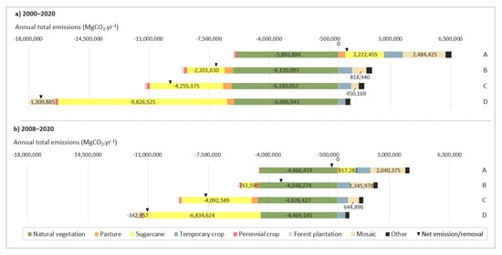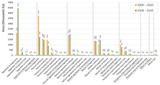 LUCs observed within the whole CARs area with sugarcane cultivation, in Brazil’s center–south and north regions, during the 2000–2020 and 2008–2020 periods. All detailed LUCs are presented in Supplementary Material S1.