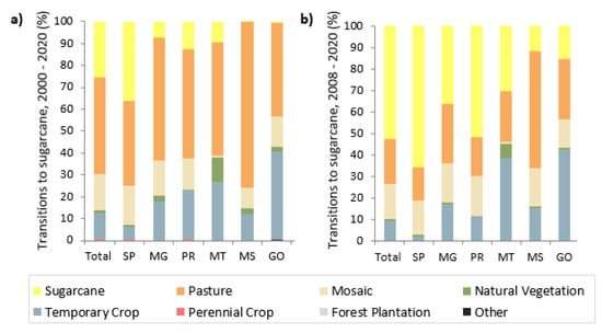 LUCs observed in areas of sugarcane cultivation during (a) 2000–2020 and (b) 2008–2020 periods in the main producing states. Sugarcane areas in the states of ES, TO, and AM are not shown as they contribute less than 0.2% of the total area of sugarcane in 2020. For details, see Tables S6 and S7.