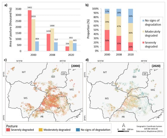 Sugarcane cultivation areas and associated CARs also showed a large expansion over pasture areas with severe and moderate degradation. There is also a relative increase in non-degraded pastures within the CARs compared with the other levels of quality (Figure 6). The area of degraded pastures in the first periods, 2000 and 2008, was much greater than in 2020. Figure 6c,d spatially represent the pasture quality level in the years 2000 and 2020 in the CARs in the states with the greatest sugarcane expansion. In 2020, not only did the remaining pastures without degradation exceed the severely degraded pastures but also some pastures with signs of degradation had their quality recovered mainly in states such as Goiás, Minas Gerais, and Mato Grosso; in São Paulo state, pasture recovery took place mainly in 2000–2008.