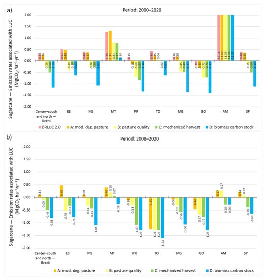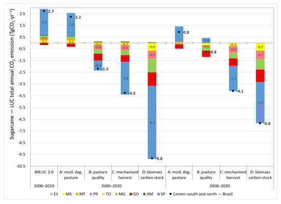 Given the importance of bioenergy for the low-carbon future and this regulatory context, this study aimed to quantify the land-use change and derived CO2 emissions associated with sugarcane cultivation, including changes in management practices and refined land-use carbon stocks factors, over the last two decades in Brazil’s center–south and north regions. We refined the parametrization of carbon stocks aiming to better represent the LUC associated with the Brazilian sugarcane expansion pattern, considering aspects such as (i) quality levels of pastures of the LUC, (ii) history of mechanized harvesting of sugarcane, and (iii) more accurate and regionalized estimates of carbon stocks in sugarcane biomass, based on recently available data, for Brazilian regions, besides the adoption of annual crops carbon stocks of the IPCC [14]. This analysis was performed considering two scopes: the sugarcane cultivation areas and the rural properties (i.e., CAR) with sugarcane production. It considered land use, land cover, and land conversion maps produced by the MapBiomas project. With this, we sought to evaluate the sugarcane LUC footprint after the implementation of policies and private mechanisms for GHG emissions control in the sector. These results are also intended to support international efforts for modeling land use so that they can more adequately reflect the conditions for expanding sugarcane ethanol production in Brazil.