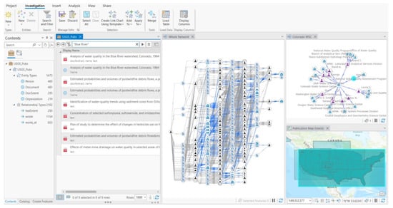 See Figure 1 as an example from the USGS of searching through an archive of publications and documents using KGs organized around citations. The figure depicts a citation network KG of publications using Esri’s ArcGIS Pro as the GIS, thereby allowing users to query by location for experts who have a particular expertise as evidenced through their publications.