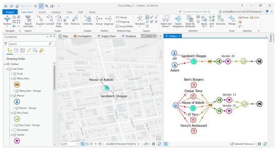 The value of combining GIS with KGs is illustrated in Figure 2, whereby querying graph structures, scientists or analysts can infer spatial relationships between graphs that appear different from each other. In other words, perform social network analysis using common graph theory techniques to identify super spreader nodes (e.g., restaurants) that leverage graph centrality, or namely, those nodes that are important. Using betweenness centrality to quantify “the number of times a node acts as a bridge along the shortest path between two other nodes” (https://en.wikipedia.org/wiki/Centrality, accessed on 1 February 2023), an analyst can discover subgraphs that trace disease pathways from farm to restaurant. When the geospatial dimension is included, two apparently disconnected paths can be connected due to some of the nodes being located at or near each other. In Figure 2, for example, the location of the “Sandwich Shop” and the “House of Kabob” each had outbreaks but are only connected because they were in the same location (left side of Figure 2). From a practical perspective, isolating the outbreak to one location reduces investigation time, leading to a quicker response to the outbreak.