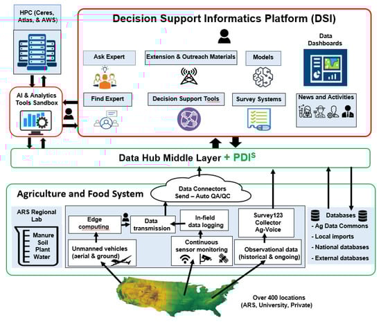 To support this process of capturing tacit and explicit knowledge and transforming it into curated knowledge products at NAL, the PDI is developing a modern, industry-standard, geo-spatial cloud-based system, which integrates diverse database networks and facilitates data sharing and cooperation among participating researchers into a geospatial framework. This Decision Support Informatics platform (DSI) increases efficiency and cost savings by bringing siloed research into an enterprise research platform built on USDA’s standard around GIS and the Federal Office of the Chief Information Officer (OCIO) emphasis on being cloud-first. This infrastructure also provides an environment or field-oriented platform for other technology organizations to build innovative applications, including IoT sensor data for field and other Big Data collection to help scientists and farmers easily capture data; mobile data capture for disease management; satellite and drone imagery for measuring the impact of soil regenerative practices, and machine data capture for crop health and yield estimation, to name a few. Other features will include Find and Ask the Expert which allows ARS scientists and collaborators to locate experts with tacit and explicit knowledge. The resulting cloud-based, logical architecture (Figure 3), after pipelines are developed between DSI and other Agency IT infrastructure assets, directly reflects the described knowledge pyramid [70]. Data and data feeds are captured and stored in the Agriculture and Food System layer; searchable, geospatial information fed from the lower layer reside in the Data Hub Middle Layer; and knowledge is consumed in the DSI layer. As with any data management platform, The Data Hub Middle Layer is designed to drive data standards, data interoperability, security, and cost efficiency. Furthermore, also shown is the AI and Analytics Tools Sandbox that is used to produce computationally intensive information products like geospatial analytic models suggested in Fitzgibbon et al. [71]. In other words, the architecture models the basic workflow of KM for capturing, organizing, sharing, and reusing knowledge derived from data and models, all within a corporate governance framework.