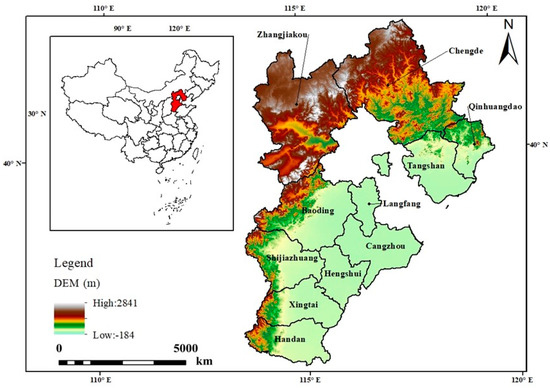 Hebei Province (36°05′–42°40′ N, 113°27′–119°50′ E) is a component of the Beijing–Tianjin–Hebei economic circle and is situated in the North China Plain, covering an area of 188,800 km2 (Figure 1). The geography is made up of wide plains in the center and southeast and mountains, hills, and plateaus in the north and west. Temperatures and precipitation fall from the southeast to the northwest. More than one-third of the provincial land is cultivated with grain crops [14]. The province’s agricultural output value ranks among the top ten in China, and it is one of the country’s main grain bases as well as the area with the most prominent imbalance of water and land resources [38]. Since groundwater extraction is the primary method used for agricultural irrigation [39], groundwater reserves have emerged as a crucial pillar of regional food security. The proportion of water consumption in agriculture decreased from 76.23% in 2000 to 58.92% in 2020 [40], and the amount of land that could be used for agriculture shrank from 68,570.67 km2 to 60,113.33 km2 [41].