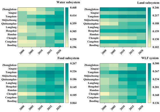 Evolutionary trends in the comprehensive evaluation indices for each subsystem and WLF system in 11 cities in Hebei Province from 2000, 2005, 2010, 2015, and 2020.