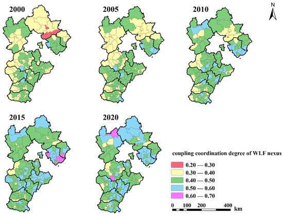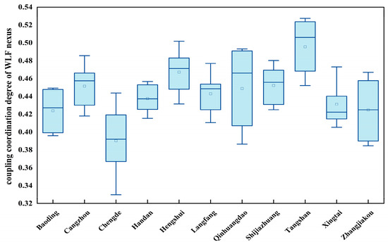 The degree of coupling coordination of the WLF nexus system in 11 cities of Hebei Province.