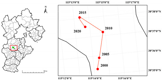 The variation in the trajectory of the gravity center of the WLF nexus system in Hebei Province is shown in Figure 6. The gravity center shifts from 115°14′14″ E, 38°35′19″ N to 115°13′41″ E, 38°37′32″ N and has always been in Wangdu County in Baoding. The trend of the movement’s trajectory is northwest–southeast. The maximum movement distance from 2015–2020 is 3.123 km, and the minimum distance from 2000–2005 is 1.098 km (Table 4).