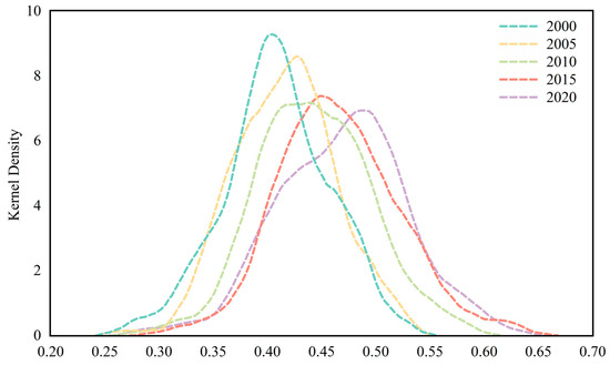 In terms of the number of peaks, the kernel density curve evolves from “single peak” to “multi peak” during the study period. There are “single peaks” in the years 2000, 2005, and 2015; “multiple peaks” in 2010, with no obvious prominent main peak; and “double peaks” in 2020, with the right side as the “main peak” and the left side also being prominent. During the study period, the degree of coupling coordination is divergent. From the kurtosis of the curve, from 2000 to 2020, the nuclear density curve gradually becomes slower and lower, evolving from a “sharp peak” form to a “broad peak” form, with the phenomenon of catching up between counties with lower levels of coupling coordination and counties with higher levels. The tails of both sides become longer, the gap between counties gradually expands, and the spatial non-equilibrium becomes stronger; however, there is no phenomenon of individual counties dominating.
