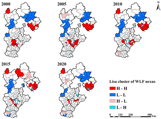 The coupled coordination system of the WLF nexus system showed a trend of spatial aggregation. The H-H gathering area is mainly distributed in the north of Zhangjiakou, the south of Tangshan and Qinhuangdao, and the county at the junction of Shijiazhuang, Hengshui, and Xingtai. The L-L type agglomeration area is located in the southeast of Chengde, Zhangjiakou’s southwest, and the junction of Baoding in the north. The H-L and L-H types are distributed across counties.