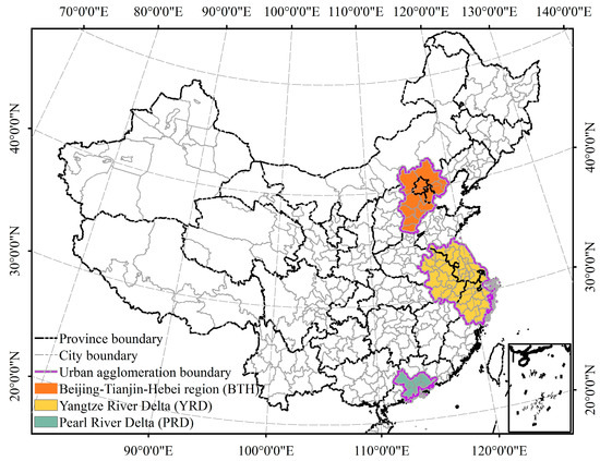 The study area and the spatial distribution of three urban agglomerations in China.