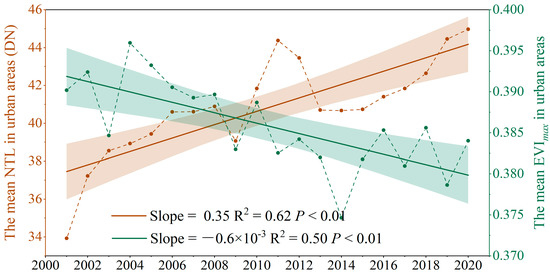 Interannual variability of the mean NTL and the mean EVImax in urban areas in China during the period of 2001–2020. A colored solid line represents linear regression. The slope is derived from linear regression. The shaded area represents the 95% confidence interval.