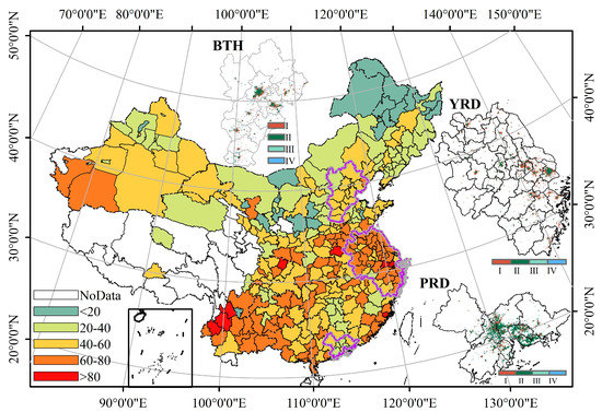 The percentage of urban areas with a decoupling status in each city. Inset shows the spatial pattern of the different relationships between nighttime lights (NTL) and annual maximum EVI (EVImax) in each urban area in Beijing-Tianjin-Hebei (BTH), the Yangtze River Delta (YRD), and the Pearl River Delta urban (PRD) agglomerations. I indicates a decoupling status, Ⅱ indicates a coupling status, Ⅲ indicates a negative decoupling status, and Ⅳ indicates a negative coupling status.