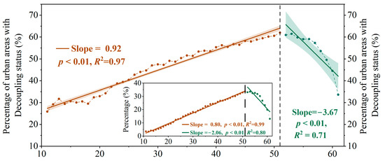 The relationship between the percentage of urban areas with a decoupling status and the mean NTL during the period of 2001–2020 in China. The solid line represents the linear regression of the percentage to mean NTL before and after the turning point (TP). The shaded area represents the 95% confidence interval, and the slope is derived from linear regression before and after the turning point, respectively. The black dashed line indicates the TP. The potential turning point was detected by the piecewise linear regression. The p value denotes significance. The inset is similar, but for the percentage of urban areas with a strong decoupling status.