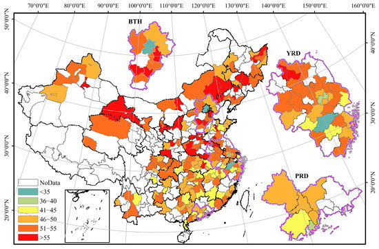 Based on the piecewise linear regression method, the threshold of the decoupling status between NTL and EVImax was detected in each city (Figure 5). The threshold was found in 189 cities out of 344 (54.65%), which were mostly located in the eastern half of the country. Overall, the thresholds of decoupling status in most cities were greater than 40. Spatially, the thresholds in 103 cities out of 189 (54.49%) were greater than 50. In contrast, only 2.11% of cities had a threshold of less than 40. This low threshold was mostly found in the developed cities of China. For example, the threshold of decoupling status between NTL and EVImax in Beijing, Shanghai, and Hangzhou was 27, 41, and 35, respectively.
