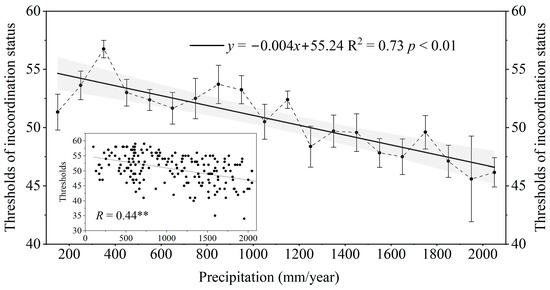 Variations in thresholds of decoupling status along the spatial gradient of long-term average annual accumulated precipitation in all urban areas in each city (Pmean) from 2001 to 2020. Points show the threshold of decoupling status averaged from cities for each 100 mm bin of Pmean. Error bars indicate the standard error of the mean (SEM). The solid line represents the linear regression of the mean threshold to Pmean, and the shaded area represents the 95% confidence interval. The p value denotes significance. The inset shows the spatial correlation coefficient between thresholds of decoupling status and Pmean in all cities. ** indicates significance of p < 0.01.