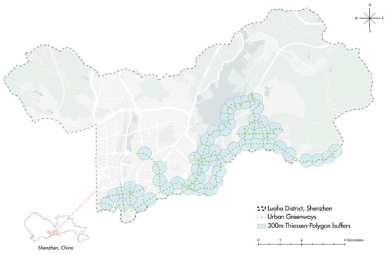 Based on greenway data from the Shenzhen government’s open data platform, this study selected 23 urban greenways in the Luohu District after excluding those with incomplete data or bicycle-access bans. Consequently, the creation of buffers around the greenways was required to investigate the impact of the built environment on cycling behaviour at a spatial scale. To avoid overlapping buffers and double-counting of cycling activity, we used the Thiessen-polygon method to ensure that they were all independent [22,97,98]. The sampling points were generated along the path of each urban greenway on a 500 m scale, and buffer zones of 300 m were created using ArcGIS Pro software based on the greenway sampling points (Figure 1).