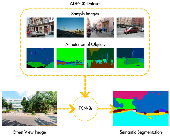 Deep learning methods are able to extract high-dimensional visual features to enhance the understanding of images [1,106]. Moreover, semantic segmentation models can detect the proportion of different types of objects in street-view images [58,73,107]. Therefore, they have become the primary tool used for streetscape processing in the built environment field [52]. This study used a visual image semantic segmentation program [62] and trained the fully convolutional network (FCN) using the ADE20K dataset [108]. FCNs have been shown to successfully identify everyday objects in street-view images and predict their semantic properties [53,58]. The pixel comparison accuracy of the network was 0.814426 and 0.66839 for the training and test datasets, respectively. The street-view image data acquired were then processed by this trained segmentation model (Figure 2).