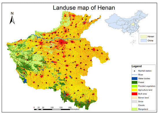 China is the second-largest economy in the world, with widely varying geographic and climate features [58]. China frequently experiences natural disasters, of which flooding is the most serious. The Yellow River Basin, the second largest river in China, has unique river valley topography. Climate change brought abundant rainfall and frequent storm floods to the north and central region of Henan province, where the Yellow River meanders. Consequently, the persistent and heavy precipitation led to several floods in the cities of Zhengzhou, Kaifeng, and Xinxiang in the north center of Henan province between 2004 and 2009 [53], 2010, 2012, 2016, and 2021 [59]. Figure 2 below shows the land use of Henan province, and Table 2 shows the historical rainstorms in the region.