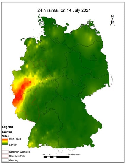 24 h rainfall on 14 July 2021 in most affected states in Germany. Source: [57]).