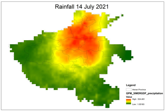 From 17 to 23 July 2021, Henan province witnessed rare and extremely heavy rain under the combined influence of an unusually powerful Western Pacific subtropical high and Typhoon In-Fa, resulting in an extreme flood event named the 7.20 Henan rainstorms. Zhengzhou received 201.9 mm of rainfall from 16:00 to 17:00 on 20 July, 382 mm in 6 h, and 552.5 mm in 24 h, breaking the highest record of 198.5 mm in one hour in 75.8 on the Chinese mainland. The average rainfall for the whole province was 222.9 mm. The maximum daily rainfall registered at Zhengzhou station was 624.1 mm, close to the total annual rainfall of 641 mm for the station and 3.39 times the maximum daily rainfall since the establishment of the station (184.1 mm, 1 July 1978), as shown in Table 11 and Figure 8. Following this incident, the total annual precipitation in 39 counties exceeded 50% of the climatological mean; 10 counties, including Zhengzhou, Huixian, and Qixian, received more total precipitation than the mean annual rainfall. Approximately 32.8% of Henan province received more than 250 mm [1]. Over three days, 1073 mm of rain was reported due to the unique weather system and local topography. The downpour led to the breach of several dams. Guojiazui reservoir was flooded by overflowing water, threatening more than ten thousand people downstream. Although there were no dam failures or casualties, the flood caused significant economic losses and social impacts [82]. Such an intense rainstorm considerably exceeded the planned capacity of the local flood control and drainage systems, causing urban floods and waterlogging the severely flooded public facilities in residential areas [83]. Despite the application of a sponge city, protecting Zhengzhou from the downpour intensity on 20 July 2021 was almost unfeasible given the state of design and technological advancements. The design rainfall varied from 15.7 to 26.5 mm for several locations and watersheds in Zhengzhou city. However, Zhengzhou city received 201.9 mm of rain between 16:00 and 17:00 on 20 July alone, which is about ten times the design rainfall of the sponge cities [84]. A massive once-in-1000-years flood resulted in the tremendous loss of life and assets in Henan [85], as shown in Figure 9, showing the flooding captured by the MODIS on 26 July 2021 compared with 20 July 2020.