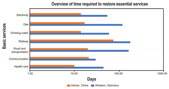 The world is witnessing an increase in catastrophic extreme weather events due to climate change and socioeconomic factors, resulting in higher global risk and exposure. Floods are impacting new areas and communities that have never experienced them before. Therefore, increasing flood resilience has become a major concern for flood-prone cities and countries. Evidence suggests that investing in disaster risk reduction (DRR) can yield substantial returns, with every USD 1 spent on DRR potentially saving between USD 4 and USD 11 in losses from various disaster events, including flooding, wildfires, and storm surges [23,24,25,26]. Despite this, only 13% of aid money is allocated to pre-event risk reduction and resilience, with 87% spent on post-event relief [27]. Though it is commonly accepted that ex ante interventions are more cost-effective than ex post emergency responses, not enough is being spent on them to avoid and reduce climate- and weather-related disasters today and in the future [18]. A better understanding of flood risks, their causes, and their effects have revealed flaws in the current flood risk management strategies. As a result, there is a growing emphasis on the resilience approach to flood risk management, which aims to reduce the impact of flooding and enhance communities’ ability to recover from its effects. Building flood resilience requires a comprehensive, multifaceted approach that addresses both local and global drivers. It is necessary to consider many uncertainties and complexities, adopt a holistic view of the issue, and strengthen preparedness and preventative measures to improve communities’ social, human, natural, financial, and physical capacities. The practical implementation of flood resilience faces several changes, particularly in terms of measurement. This study aims to assess the effectiveness of flood resilience measures and evaluate their impact on affected regions. Specifically, the study will examine the duration of recovery (availability level) and the success of risk reduction measures, measure the flood resilience index, and identify areas for improvement in flood resilience. The study will focus on the July 2021 extreme flood events and evaluate the post-flood resilience of western Germany and Henan, China. Through these analyses, the study aims to contribute to improving flood management practices globally.