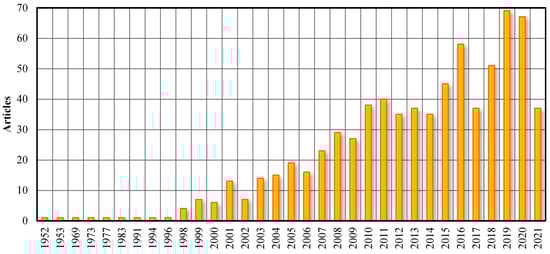 The distribution of publication time (Figure 1) shows that urban sprawl research first appeared after World War II and entered a rapid growth phase in the late 1990s. The average annual growth of urban sprawl literature from 1999 to June 2021 was over 31 articles. The research started earliest in the United States, followed by Canada. After entering the 21st century, sprawl research developed very rapidly in the United Kingdom, China, Spain, Germany, Italy, and India. It is worth noting that developing countries are gradually emerging as important battlegrounds for international urban sprawl research [9,10,45,46].