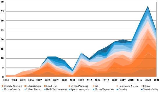 Other high-cited literature focuses on the measurement approaches and characteristics of urban sprawl—e.g., [23,32,57]—which significantly advanced the development of urban sprawl measurement studies worldwide. Following these early studies, empirical studies—e.g., [9,38,58,59,60]—emerged and ranked into the top 20 cited articles successively. The corresponding keywords of measuring techniques and methods, such as geographic information systems (“GIS”) [61], “remote sensing” [16,62,63], and “landscape metric” [64], have been widely used.